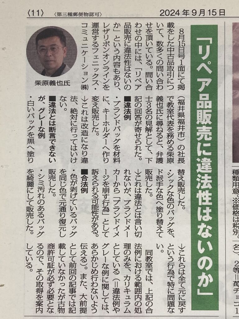 2024年9月15日の記事にて、「リペア品販売に違法性はないのか」というタイトルで再び取り上げていただきました。